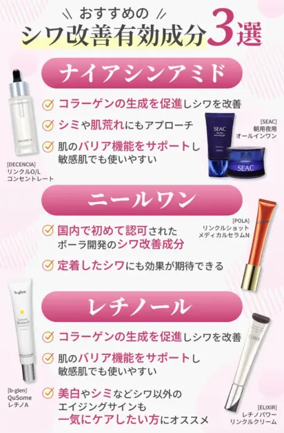 意なシワの種類、シワ以外の美容効果が異なるので、自分に合った成分を選ぶようにしましょう。