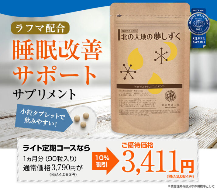 「北の大地の夢しずく」は、そんな睡眠のお悩みに寄り添う機能性表示食品です。2022年モンドセレクション銀賞を受賞し、医師も推薦する実力派のサプリメントとして注目を集めています。