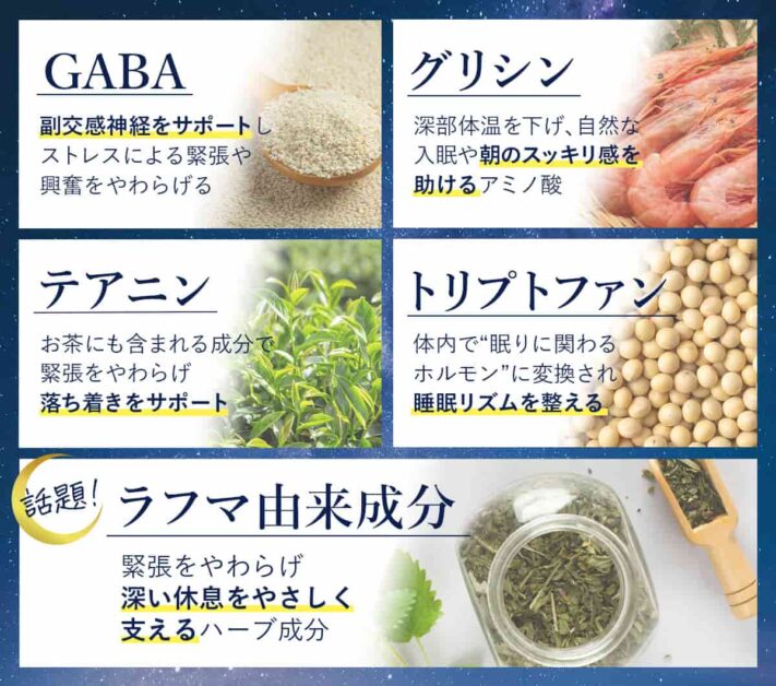 睡眠サプリには、リラックスや入眠、睡眠リズムをサポートするとされる成分がいくつか配合されています。