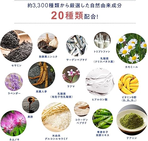 しかも、カモミールやラベンダー、高麗人参、黒酢など、体に嬉しい自然由来の素材が全部で20種類も入っており、あなたの健康をトータルでサポートします。