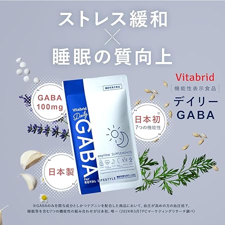※GABAのみを関与成分としかつテアニンを配合した商品において、血圧が高めの方の血圧低下、睡眠等を含む7つの機能性の組み合わせが日本初、唯一(2024年5月TPCマーケティングリサーチ調べ)