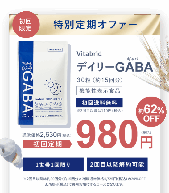 1世帯1回限りの特別価格なので、日本初の7つの機能性を持つGABAサプリをぜひこの機会に体験してみてくださいね♪