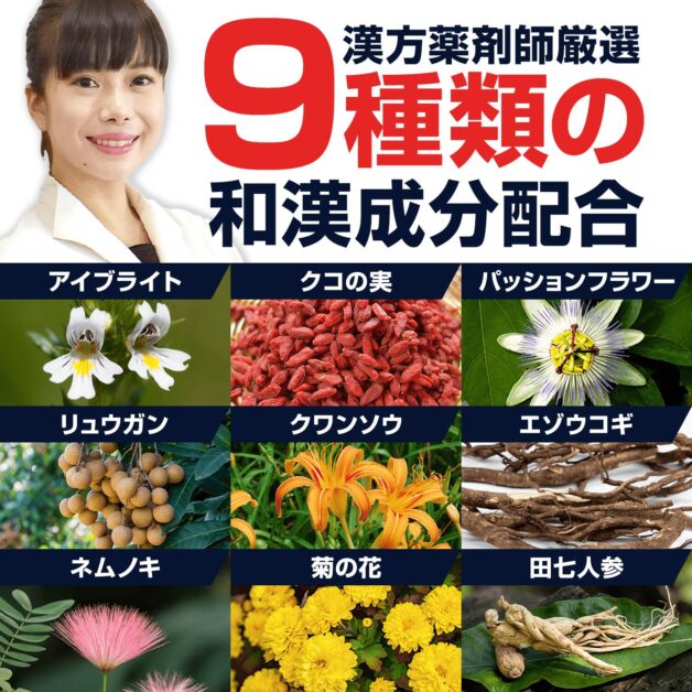菊の花、リュウガン、クコの実、クワンソウ、パッションフラワー、アイブライト、エゾウコギ、有機田七人参、ネムノキ。これらを自然由来の素材として、たった2粒に凝縮しました。