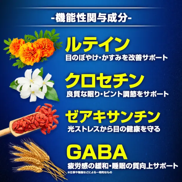 目の黄斑部の色素量を増やし、紫外線やブルーライト光などの光ストレスから保護し、コントラスト感度(色の濃淡を判別する力)を改善する機能が報告されているルテイン、ゼアキサンチンを配合。さらに、睡眠の質の向上、ストレスの緩和、高めの血圧を低下する機能が報告されたGABAを配合。