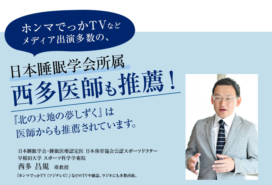 「北の大地の夢しずく」は、「ホンマでっかTV(フジテレビ)」などのTVや雑誌、ラジオにも多数出演されている睡眠医療認定医でもある、日本睡眠学会所属の西多医師(早稲田大学スポーツ科学学術院准教授)からも推薦されています。