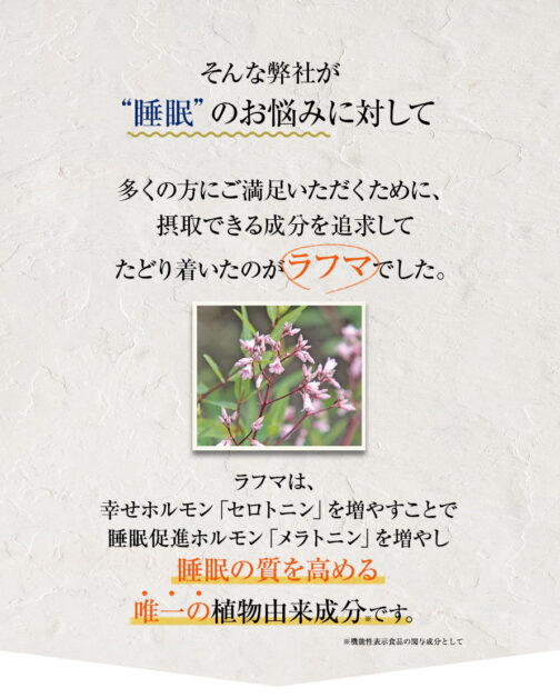 そんな同社が睡眠のお悩みに対して、多くの方に満足いただくために摂取できる成分を追求してたどり着いたのが「ラフマ」でした。