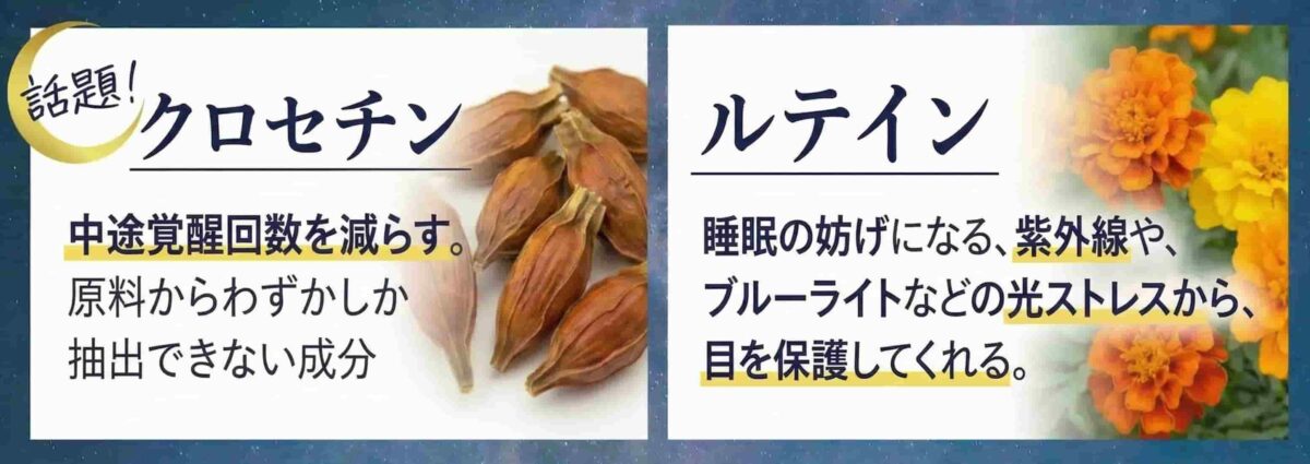 そして、この処方の核となる4つ目の成分がクロセチン。 良質な眠りをサポートし、目のピント調節をサポートする機能が報告されているクロセチンを加えることで、目と睡眠、両方へのアプローチをより確かなものにしています。ルテイン、ゼアキサンチン、GABA、そしてクロセチン。