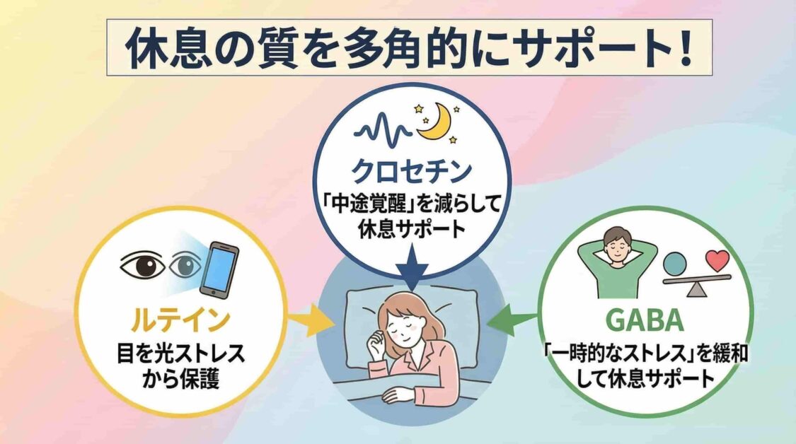 目と睡眠、両方のケアを考えている方に、自信をもっておすすめできるサプリメントです。