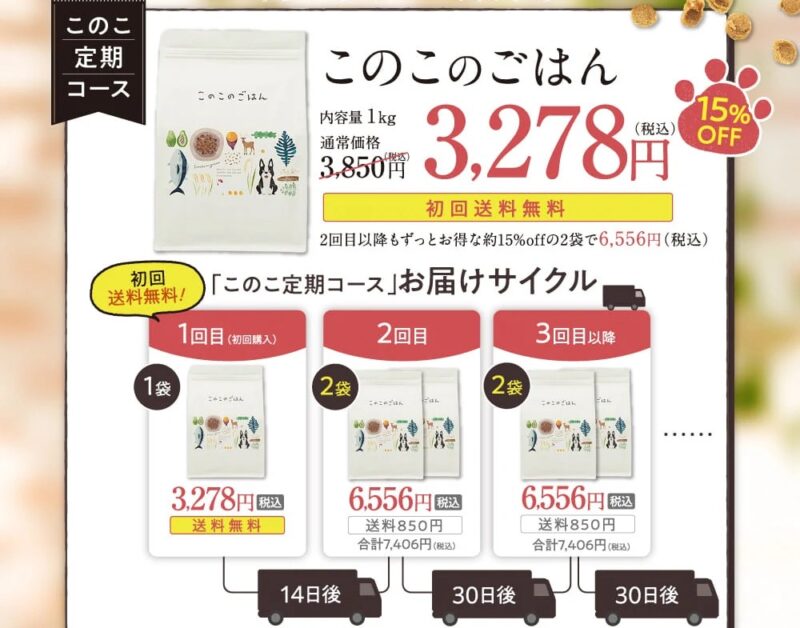 今なら初めての方限定で、定期初回が3,278円(税込)+送料無料。1袋は1kg(約15日分)で、定期コースなら2回目以降も15%OFFの1袋3,278円×2袋でお届け。定期回数縛りもなく、1回のご注文でも解約可能なので、初めての方でも気軽に始められます。