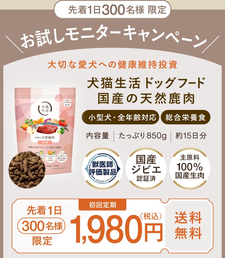 毎日与えるものだからこそ、続けやすい価格かどうかは大切な判断ポイントです。まずは定期コースの割引を活用して、愛犬の食事を見直す第一歩として取り入れてみてはいかがでしょうか。