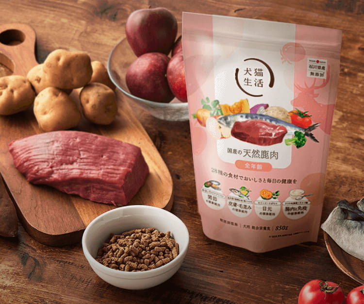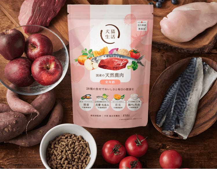国産の天然鹿肉をはじめ、雑穀やさつまいも、海藻類などの植物素材もバランスよく配合。