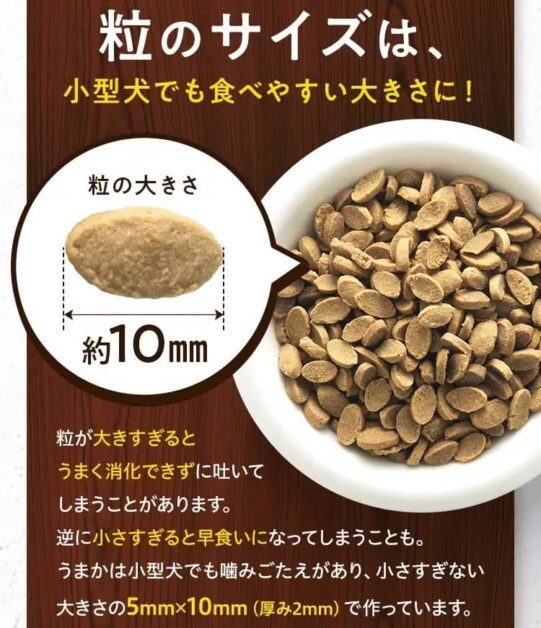 粒の形状は、小型犬やシニア犬でも食べやすいように小さめサイズに設計。