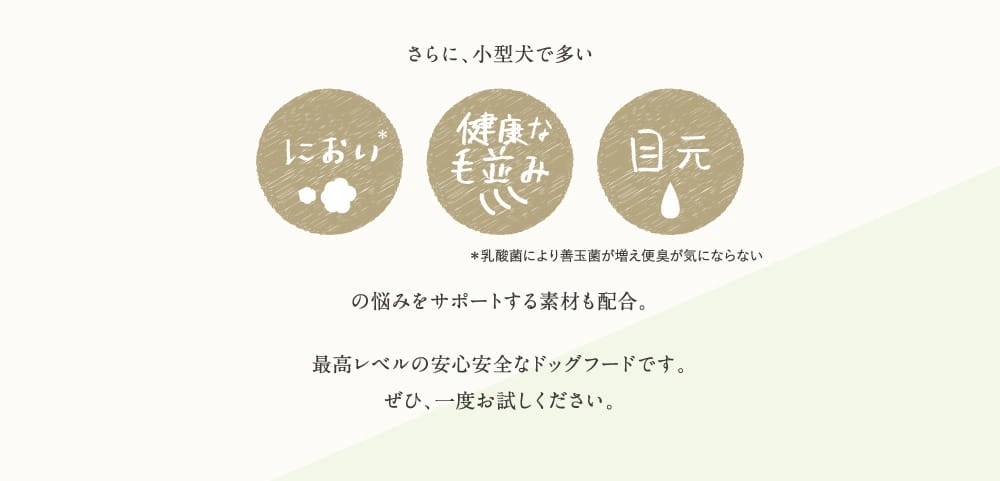 1日の食事から、すこやかな状態を目指せるように。人工的な香料や添加物に頼らず、食材の質にこだわって作られているからこそ、毎日安心して与えることができます。粒のサイズも小型犬が食べやすいように設計されており、カリカリとした食感で食いつきがいいという声も。製造はすべて有機JAS認証を受けている国内工場で行われており、品質管理体制も万全です。