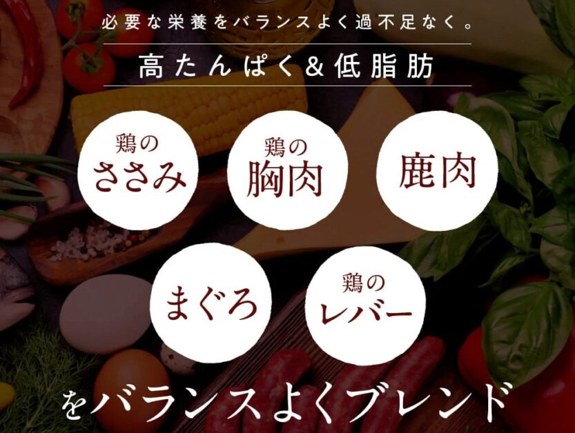 主原料には馬肉・鶏肉・まぐろ・緑イ貝を使用し、良質なたんぱく質をバランスよく配合。