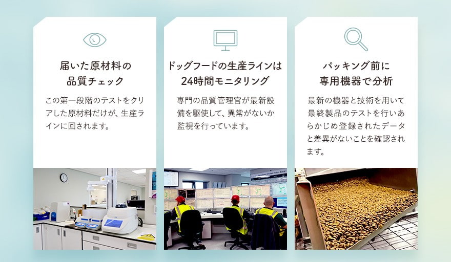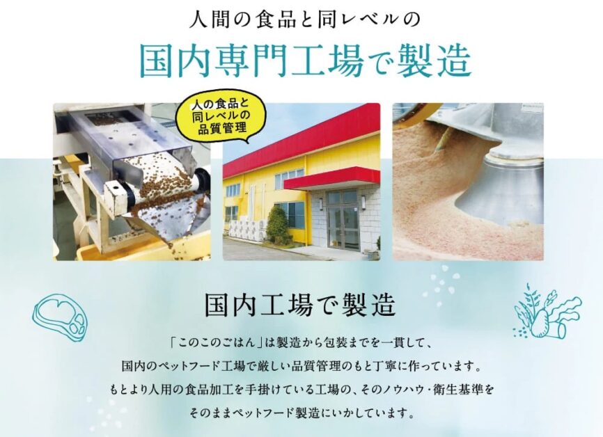 毎日の食事として続けることを前提に、素材選びから管理体制まで一貫している点は、長く与えるフードを選ぶうえで心強いポイントです。
