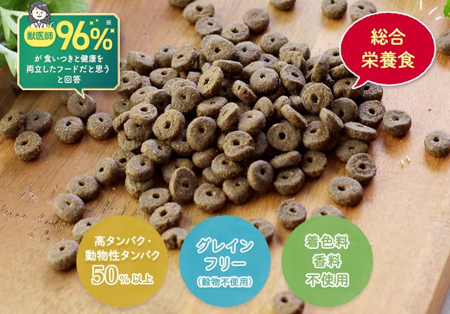 レシピ面では、動物性タンパク源を50%以上配合し、愛犬が消化しづらいとされる穀物を一切使用しないグレインフリー設計を採用しています。主食として与えることを前提に栄養バランスが調整された総合栄養食として、ペットフード公正取引協議会の定める分析試験基準もクリアしています。