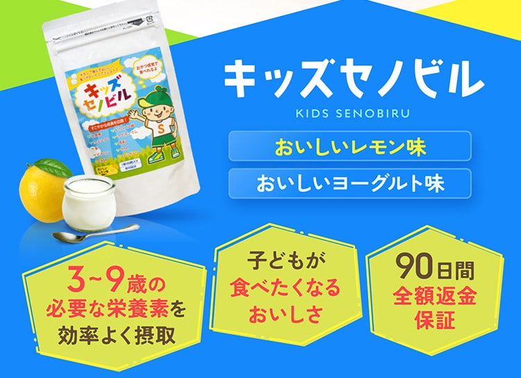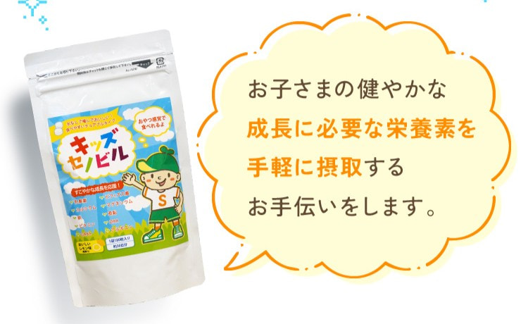 「キッズセノビル」は、好き嫌いや小食などで栄養バランスが偏りがちなお子様を支えるために開発された、成長期応援サプリメントです。毎日の食事にプラスするだけで、成長に必要な成分を効率よく、手軽に取り入れることができます
