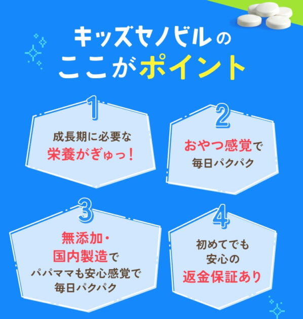 キッズセノビルは、成長に欠かせない成分を適切なバランスで配合することにこだわっています。