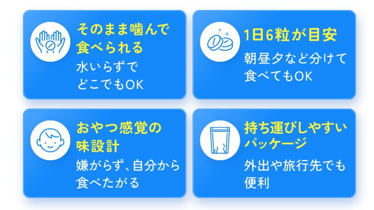 毎日無理なく続けていただくために、お子様に人気の「レモン味」「ヨーグルト味」のチュアブルタイプに仕上げました。お菓子感覚でポリポリと食べられるので、おやつ代わりに日常へ取り入れやすいのが魅力です。