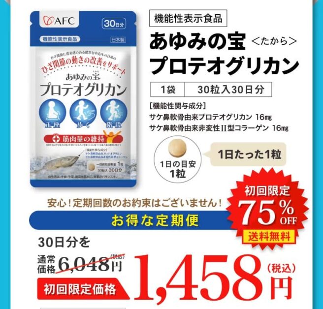 価格や条件が分かりやすい今の内容なら、ひざのケアを意識し始めたこのタイミングで、あゆみの宝 プロテオグリカンを試してみてはいかがでしょうか。