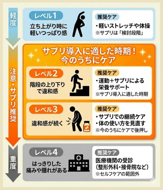 まずはあなたの膝の違和感レベルとそのレベルに合ったセルフケアについて見てみましょう!