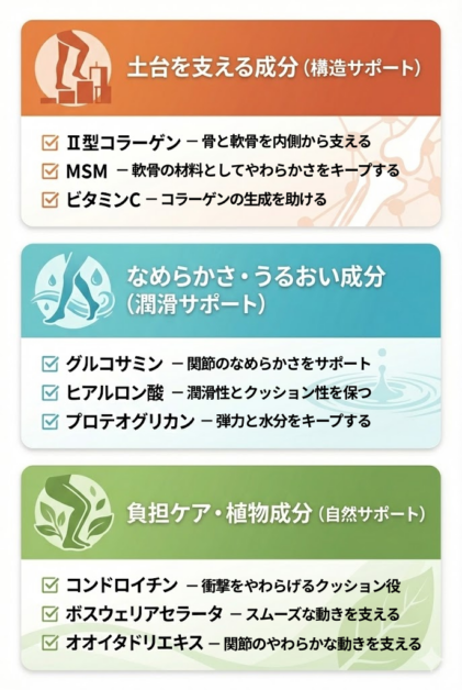 「セルフケアが大切なのはわかったけど、膝を支える成分ってどんな種類があるの?」