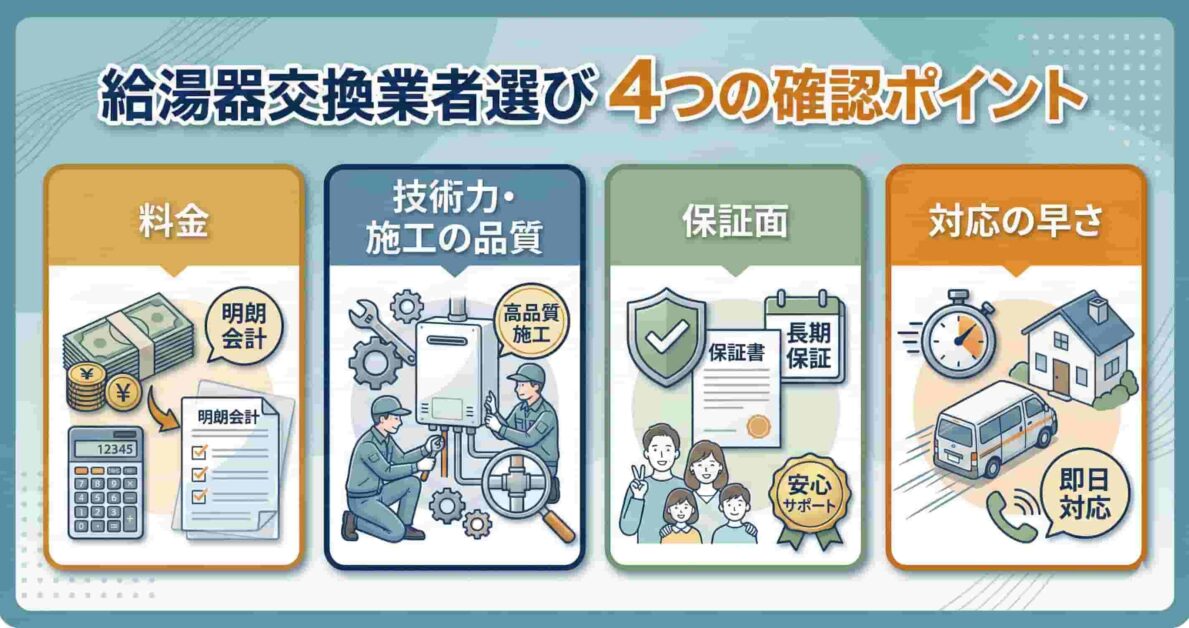 給湯器交換の専門業者って色々とあるみたいだけど、どんな事に気をつけて選ぶと良いの…?