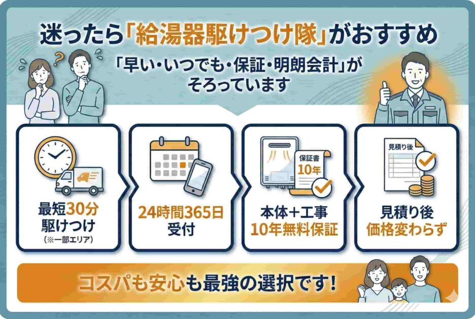 給湯器交換の専門業者選びで迷ったら、給湯器駆けつけ隊がおすすめです。