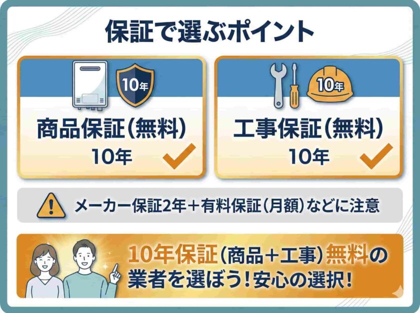 中には、メーカー保証2年+有料保証/月額などのような場合もあるので、選ぶ際は、10年保証(商品+工事)が無料の給湯器交換の専門業者を選ぶようにしましょう。
