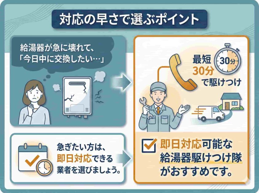 問い合わせから訪問まで時間がかかる業者が多い中、給湯器駆けつけ隊は「今日どうにかしたい」に応えます。
