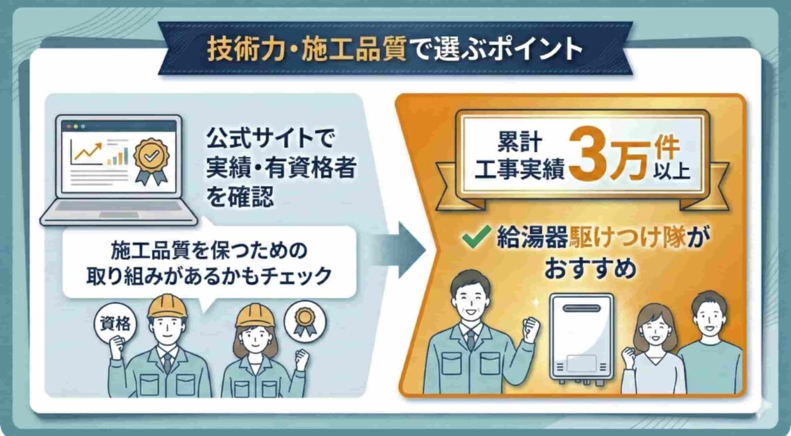 給湯器交換の専門業者を選ぶ際は、公式サイトから実績を調べたり、給湯器交換の有資格者が施工を行っているか?施工品質を高く保つためにしっかりと取り組みを行っているか?をチェックしましょう。