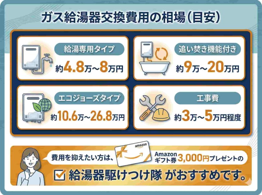 給湯器の交換費用をなるべく安く済ませたい場合は、施工完了でAmazonギフト券3,000円プレゼントキャンペーン中の給湯器駆けつけ隊がおすすめです。